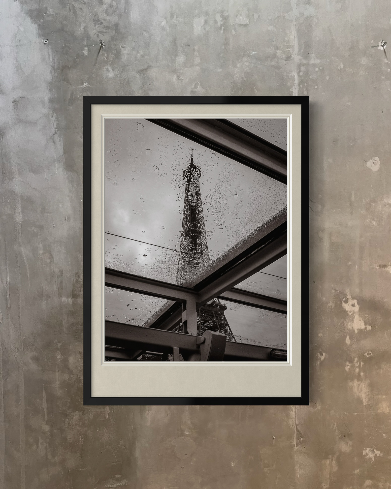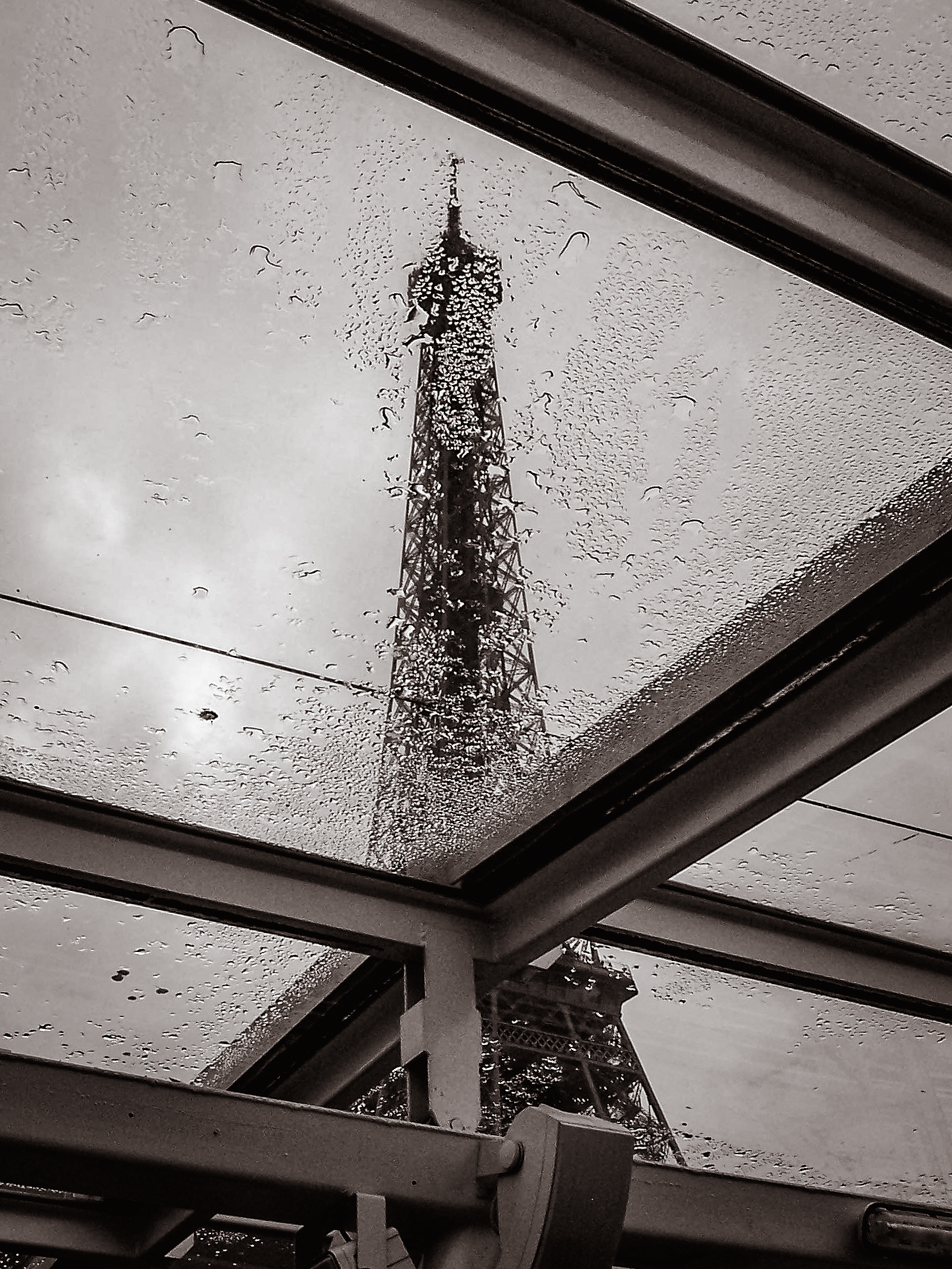 The image is built on oblique lines and quiet interruptions. The canopy’s beams cut across the scene like deliberate gestures, while the droplets act as a liquid grain—softening clarity, breaking the iconic silhouette into matter. The Tower remains recognizable, yet slightly withheld: present, but not fully given. In that restraint, the photograph finds its tone—elegant, minimal, and emotionally charged without excess.