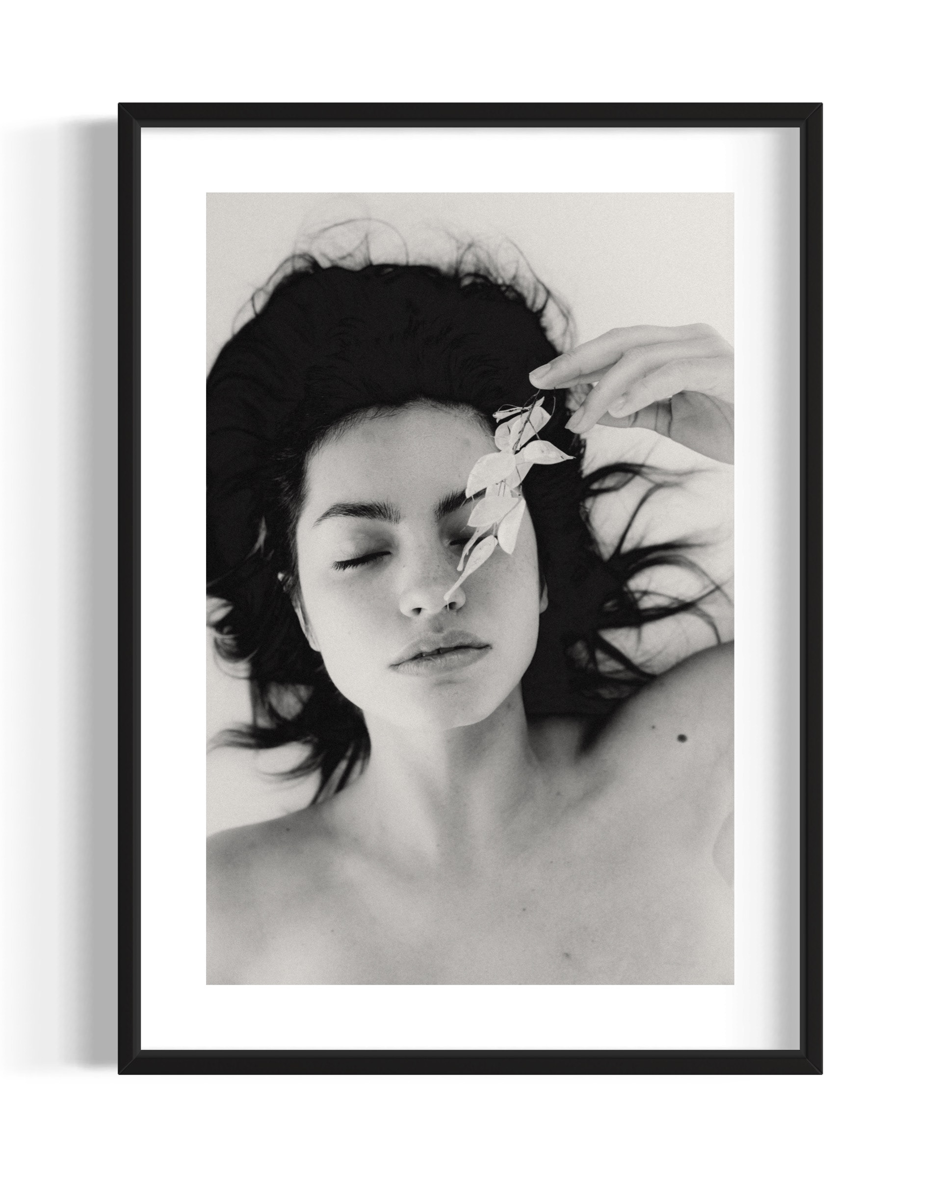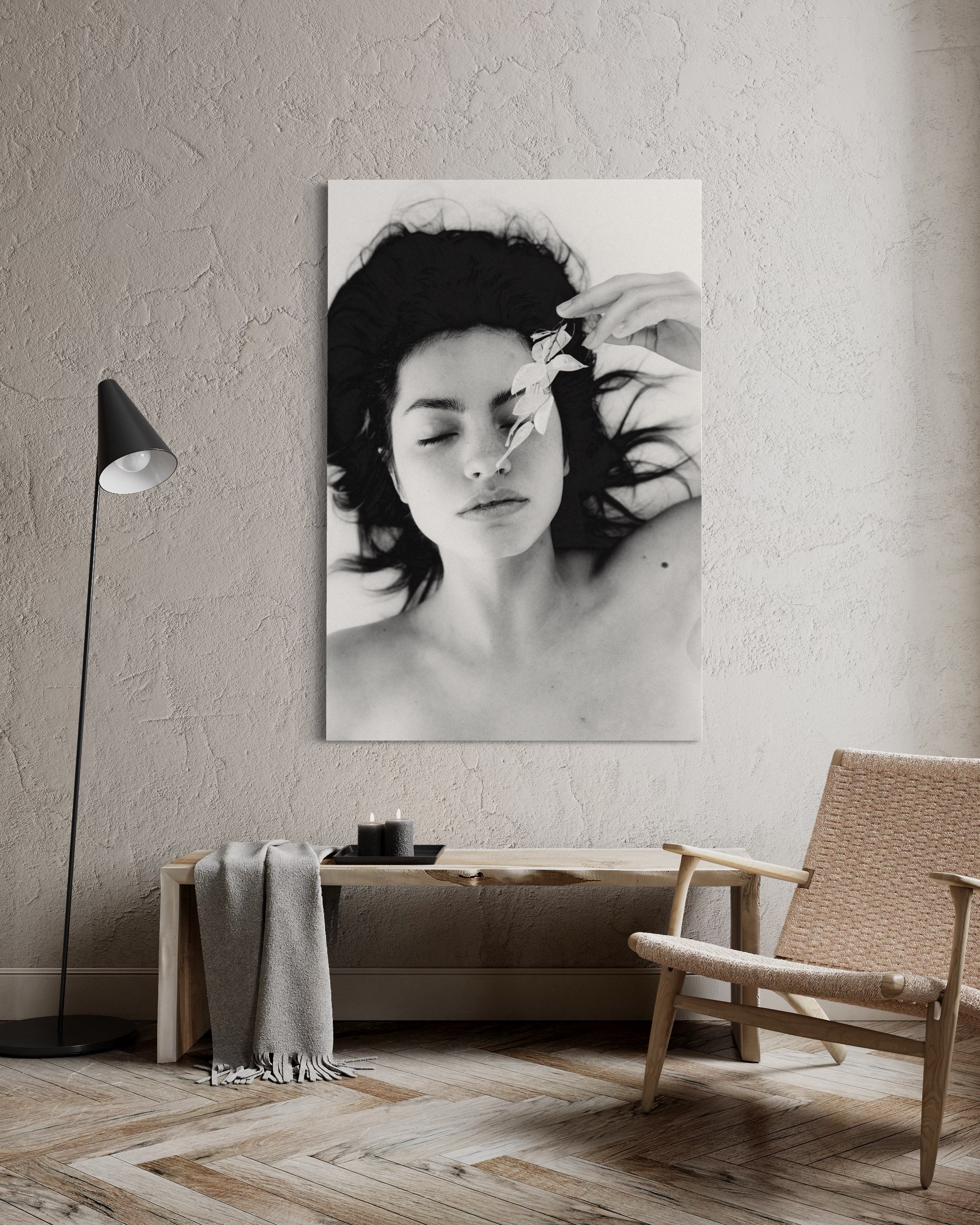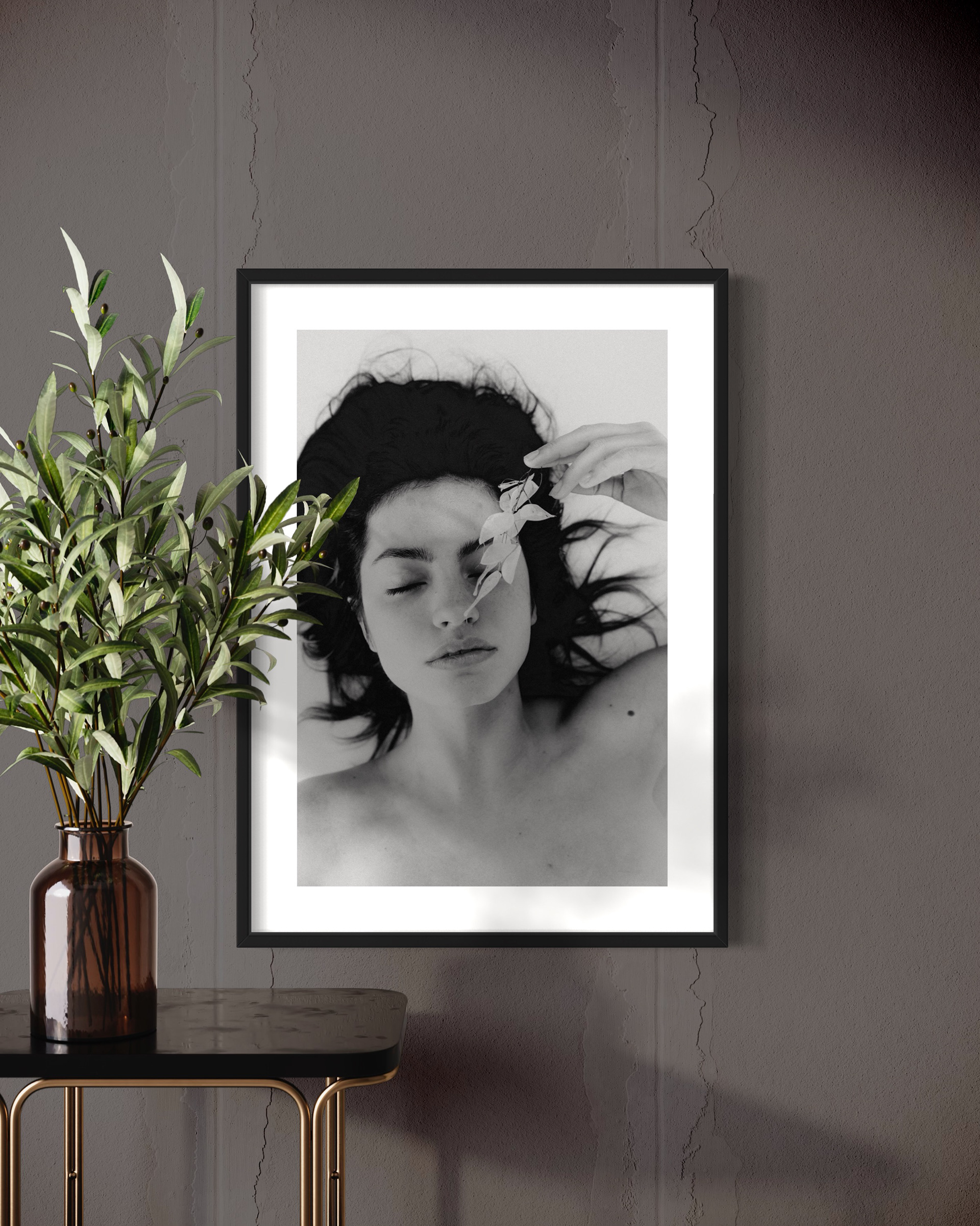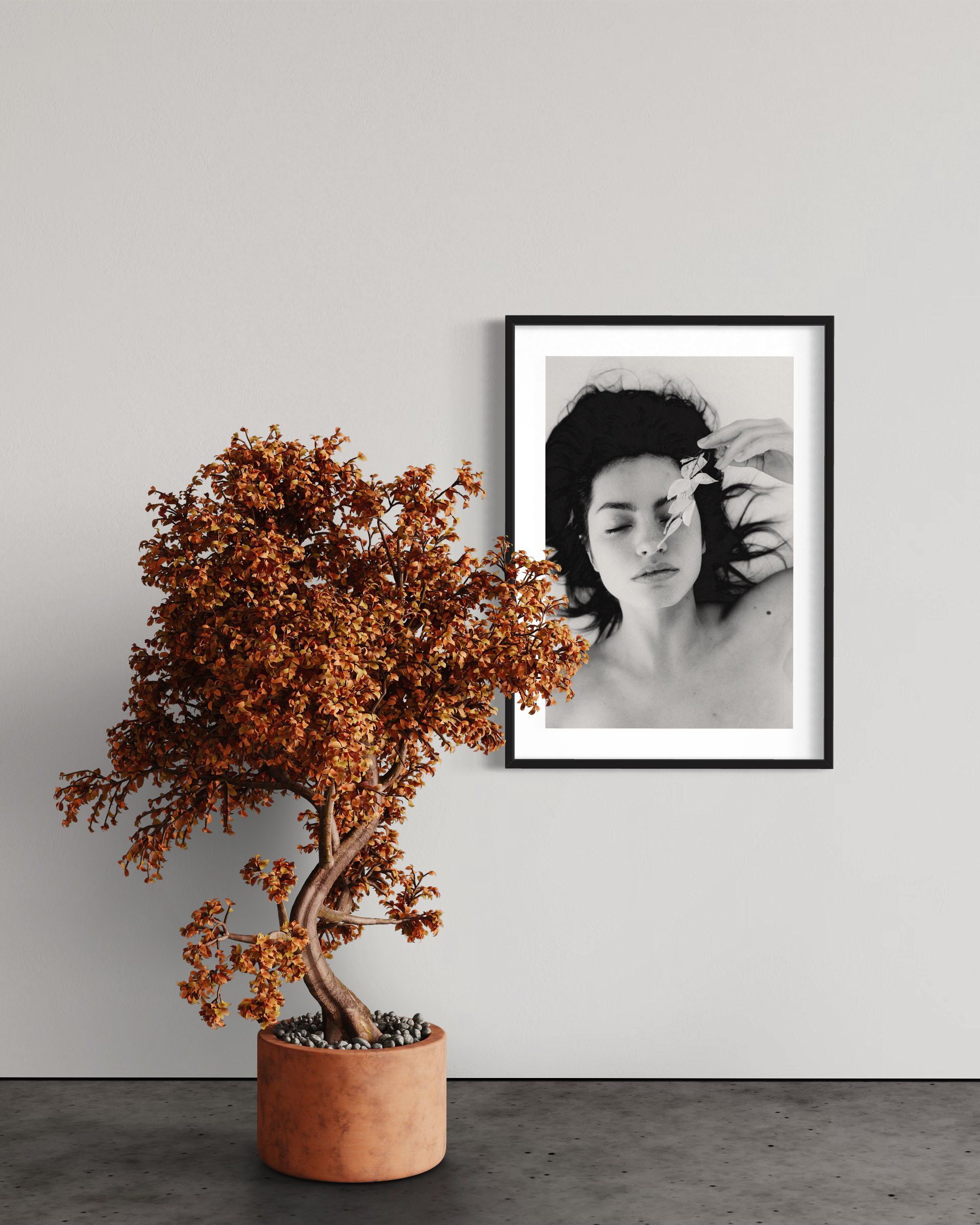 “Whispers in Contrast” captures a moment immortalized where light and shadow weave a delicate veil over the subtlety of the feminine, expressed with the clarity and brevity of a haiku. The leaves resting upon the figure convey a visual verse, a silence full of meaning within the minimalism of black and white. This composition, in its bare simplicity, is an invitation to ponder the silent elegance and the poetry of feminine subtleties.