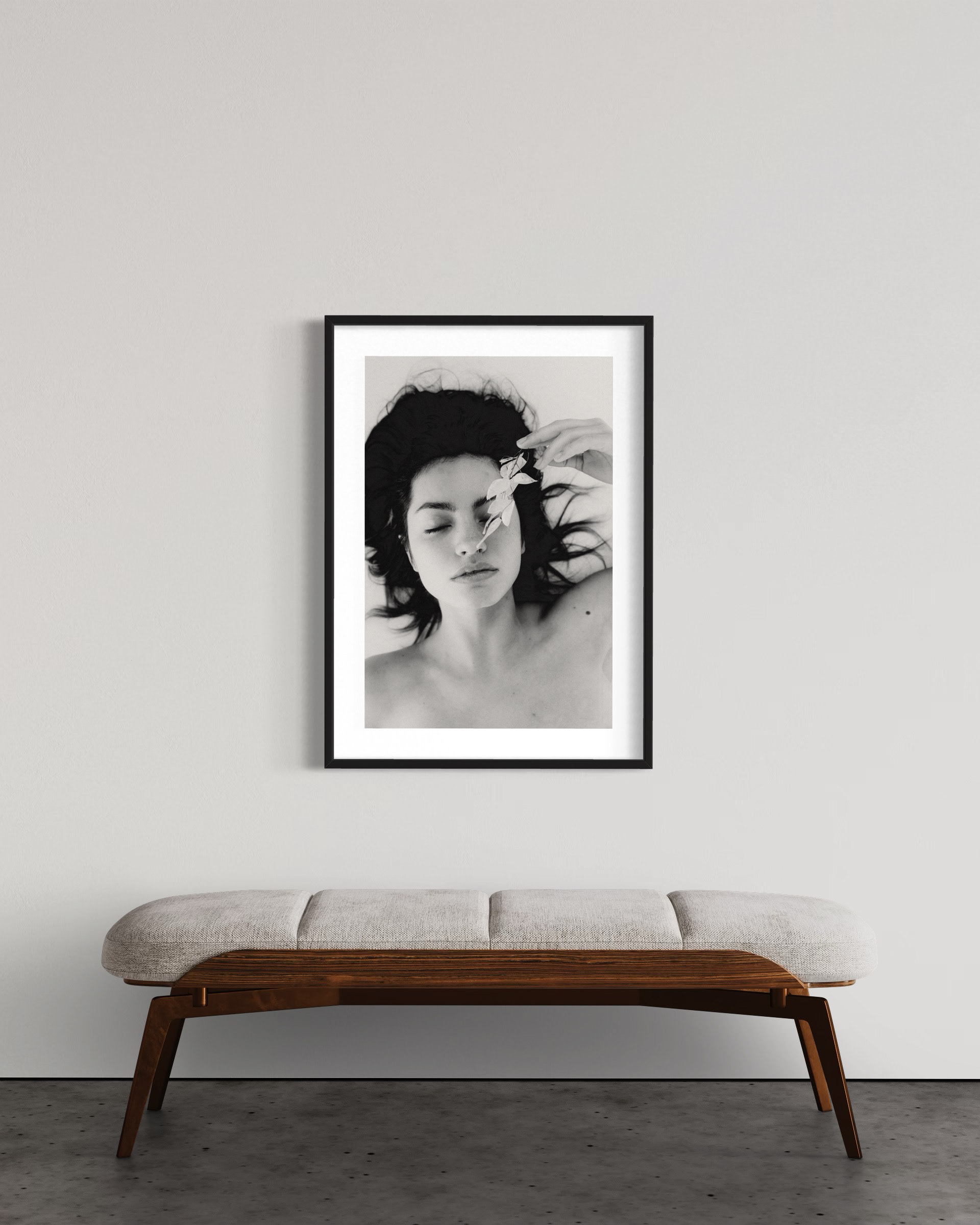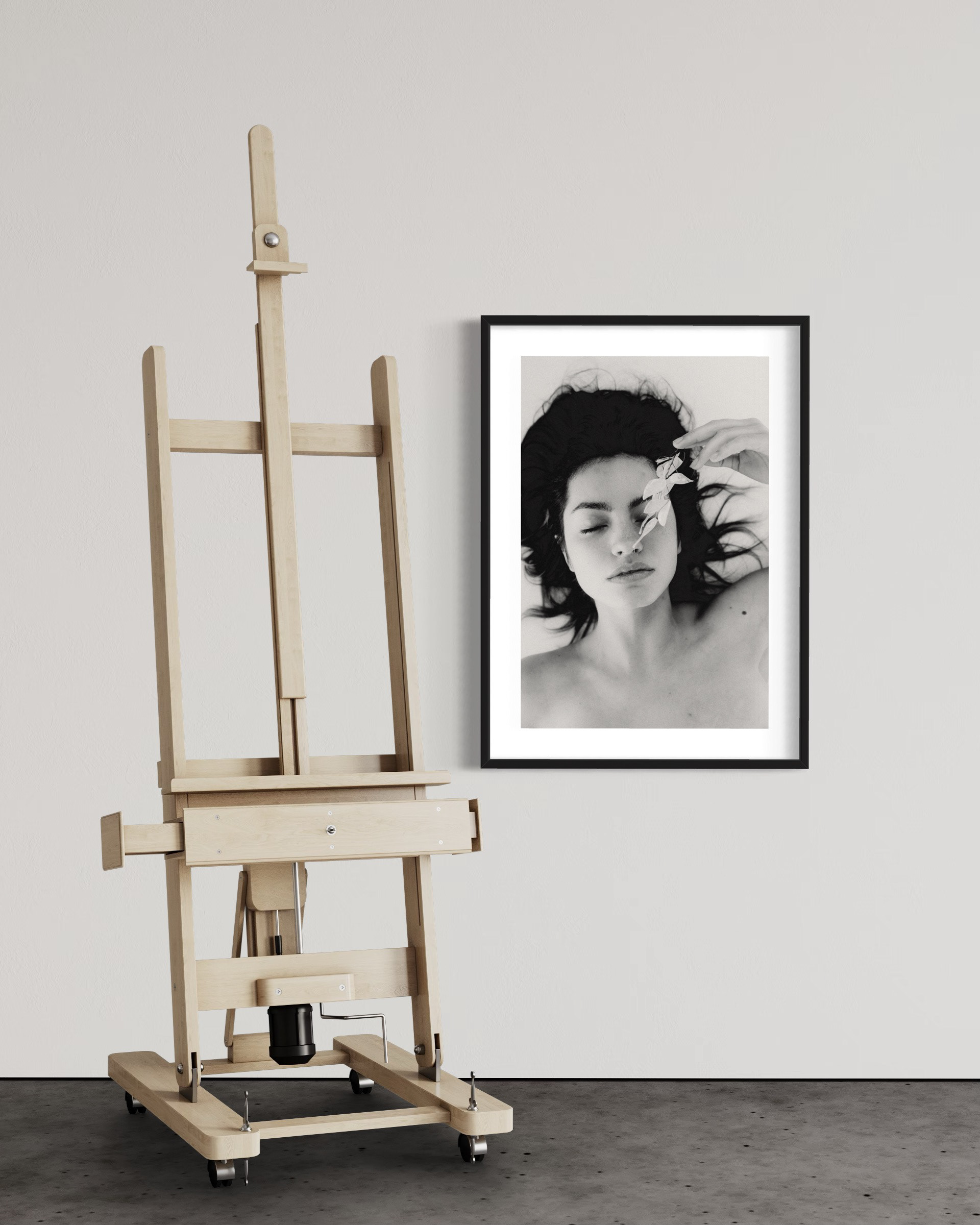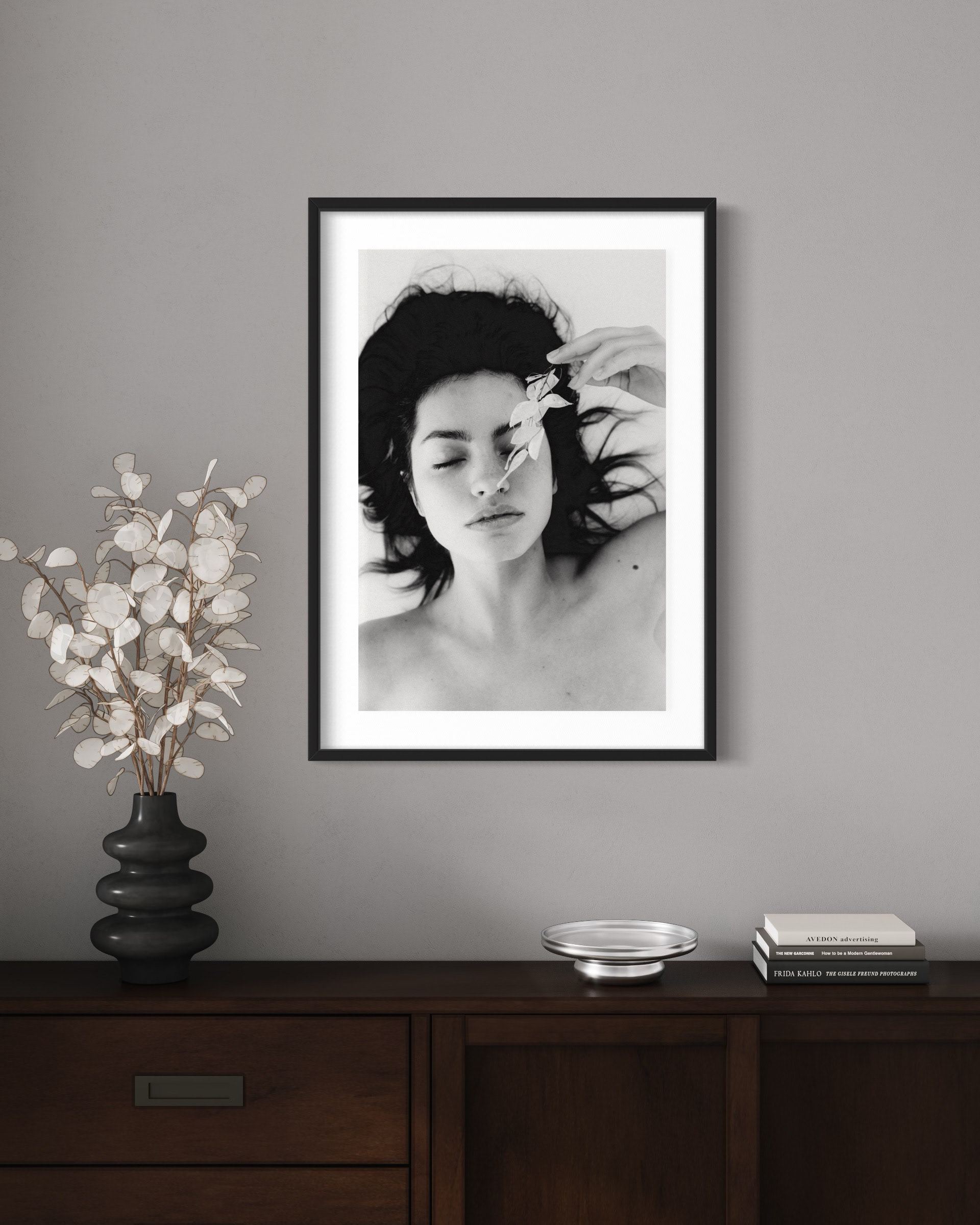 “Whispers in Contrast” captures a moment immortalized where light and shadow weave a delicate veil over the subtlety of the feminine, expressed with the clarity and brevity of a haiku. The leaves resting upon the figure convey a visual verse, a silence full of meaning within the minimalism of black and white. This composition, in its bare simplicity, is an invitation to ponder the silent elegance and the poetry of feminine subtleties.